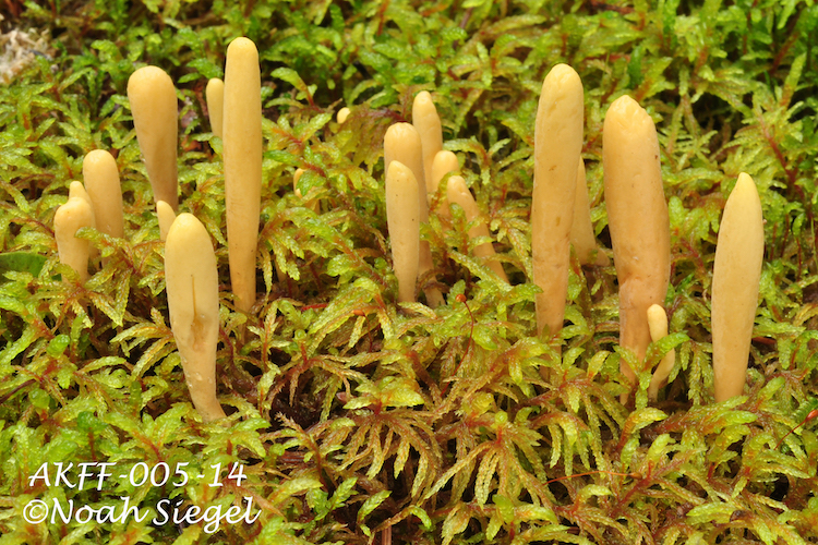- NOTES: Baseball bat shaped club, 5+- cm tall, 4-8 mm across at apex, pale yellowish-beige in color, no odor, taste mild. Growing in moss under spruce.