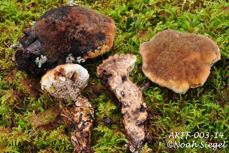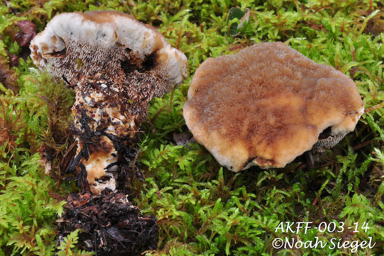 NOTES: Fuzzy brownish cap, brownish spines with whitish tips, zoned flesh with darker lines, tan/beige colors. Strong farinaceous odor, slightly acrid and farinaceous taste. On the ground in moss under spruce.