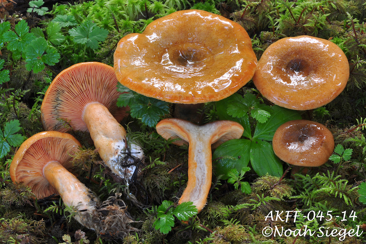 - NOTES: Cap 54-98 mm, moist, not viscid. Orange-to-dull or orange-brown, developing greenish stains. Gills orange, staining green when damaged. Stipe orangish, with greenish spots or stains. Flesh beige, greenish under cap surface, orange on stipe rind. Latex orange, unchanging. Taste mild at first, slightly acrid after 30 seconds. No odor. Under spruce and mountain hemlock.