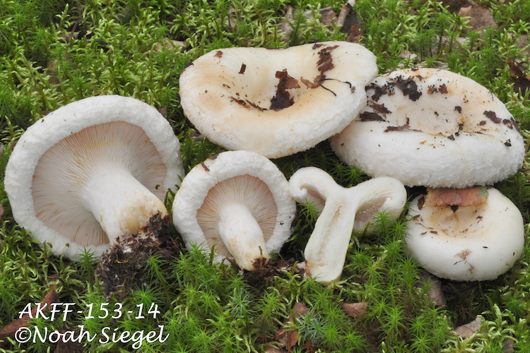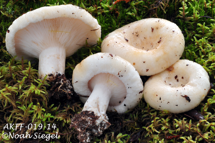 - NOTES: Creamy white viscid caps with a bearded margin, debris stuck to surface, yellowish-brown discoloration in age. White latex quickly yellowing, slowly acrid taste. Growing under birch and spruce.