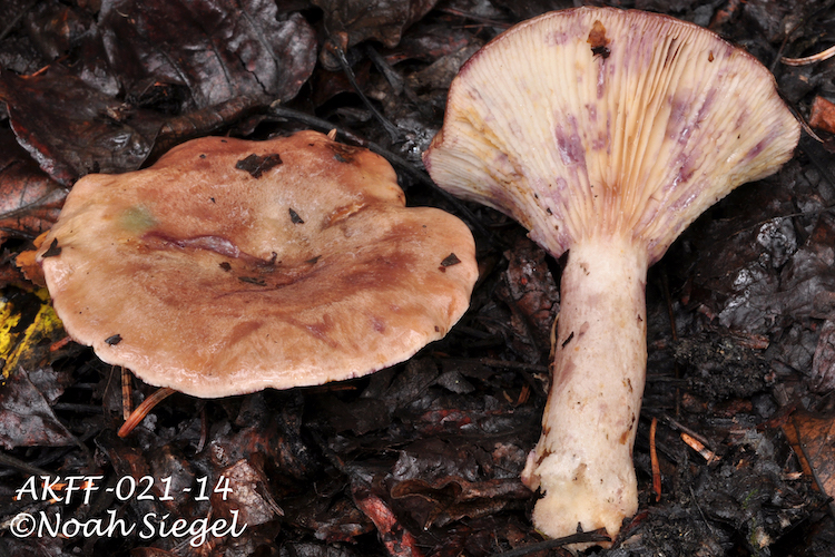 - NOTES: Cap 67-80 mm across, uplifted cap, viscid, gray/lilac tones. KOH green on surface. Gills whitish/grayish, white latex, staining tissue purple. Flesh whitish, stipe hollow. Taste mild. Odor not distinctive.