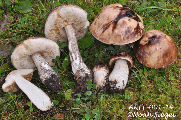 - NOTES: Under birch in the yard at the Ranger Station. Cap is thinly viscid, but appears pubescent, patchy in color, with dark blackish color with paler spots/patches. Pores grayish-brown at first, soon whitish to pale grayish, developing beige/pale brownish discoloration. Stipe with fine grayish scabers at first, becoming dark gray. Flesh creamy, slight, slow pinkish decoration in cap flesh, no staining elsewhere.