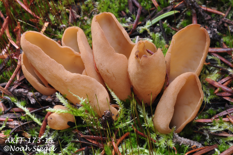 - NOTES: Small, tan, rabbit-ear cups 20-35 mm tall growing in moss and around a rotting stump.