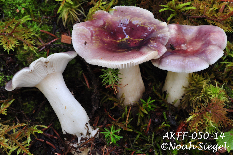 - NOTES: Purplish cap with purplish-pink margin, white gills, pinkish blushed stipe. Viscid cap, sulcate margin, mild to slightly acrid taste. Growing under mountain hemlock and sitka spruce.