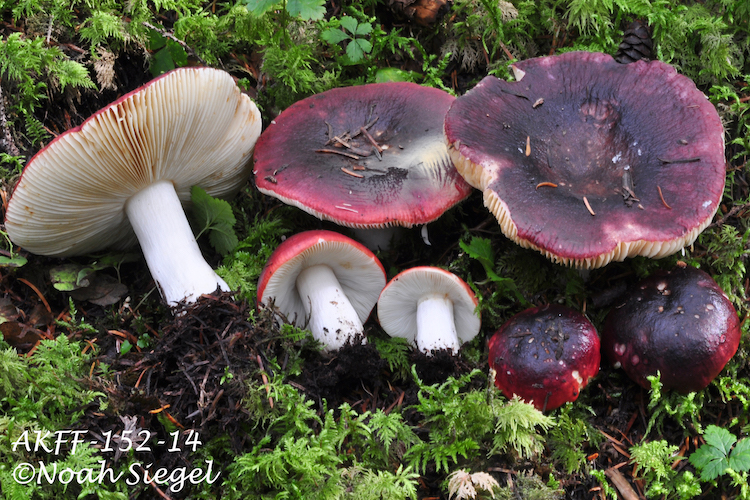 - NOTES: Caps 5-11 cm across, deep reddish-purple, mature gills pale ochre, spores yellow-ochre, stipe white, not staining, no odor, taste mild. Growing under hemlock and spruce.